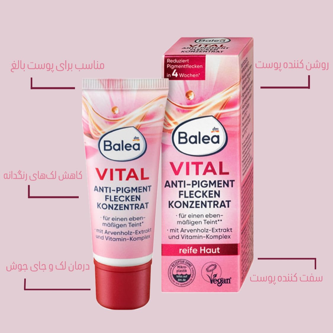 این کنسانتره به طور قابل توجهی لکهای رنگدانه را در مدت ۴ هفته کاهش میدهد طور محسوسی پوست را سفت و محکم میکند دارای خاصیت روشن کنندگی قوی برای صورت است به درمان جای جوش و انواع لک کمک میکند حاوی ترکیبات مفید: حاوی عصاره چوب درخت کاج (ArvenholzExtrakt) و مجموعه ویتامینها (VitaminKomplex) است به ویژه برای پوست های بالغ هم استفاده میشود